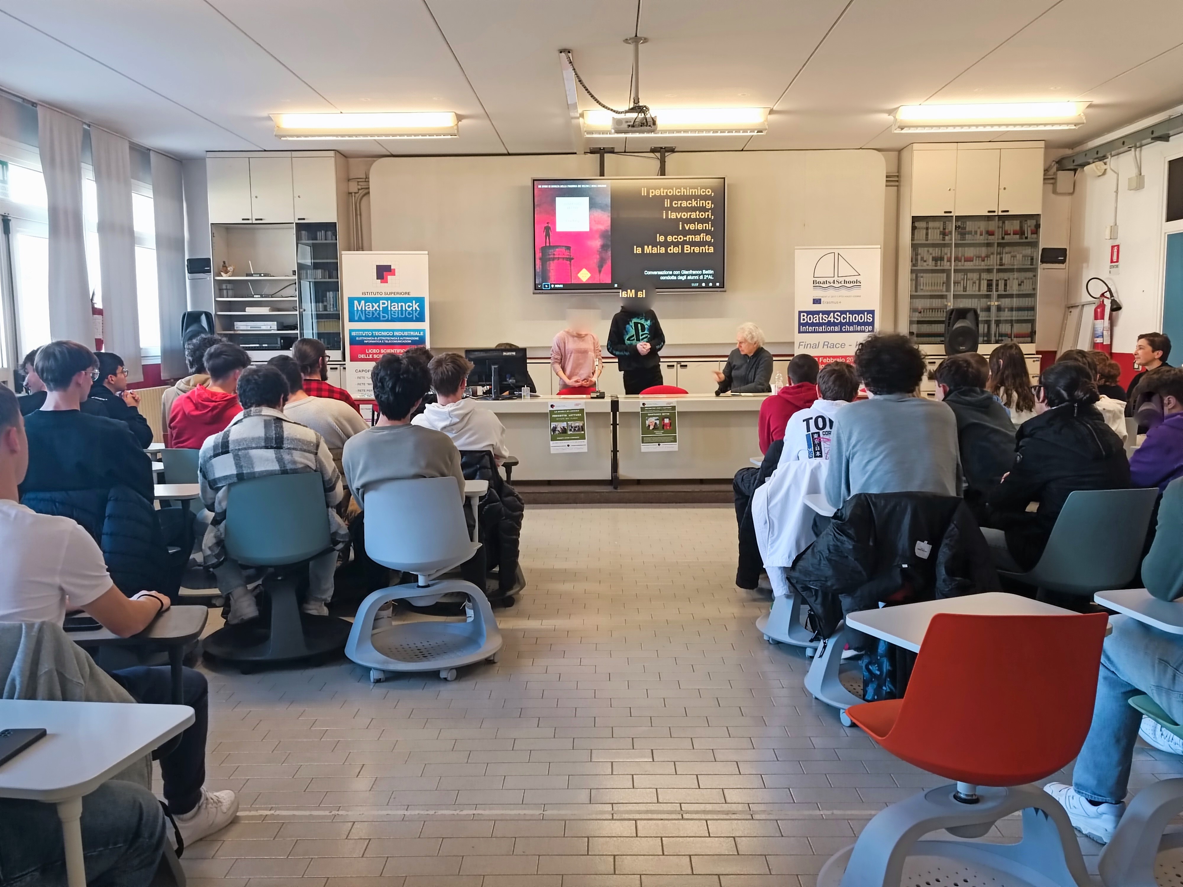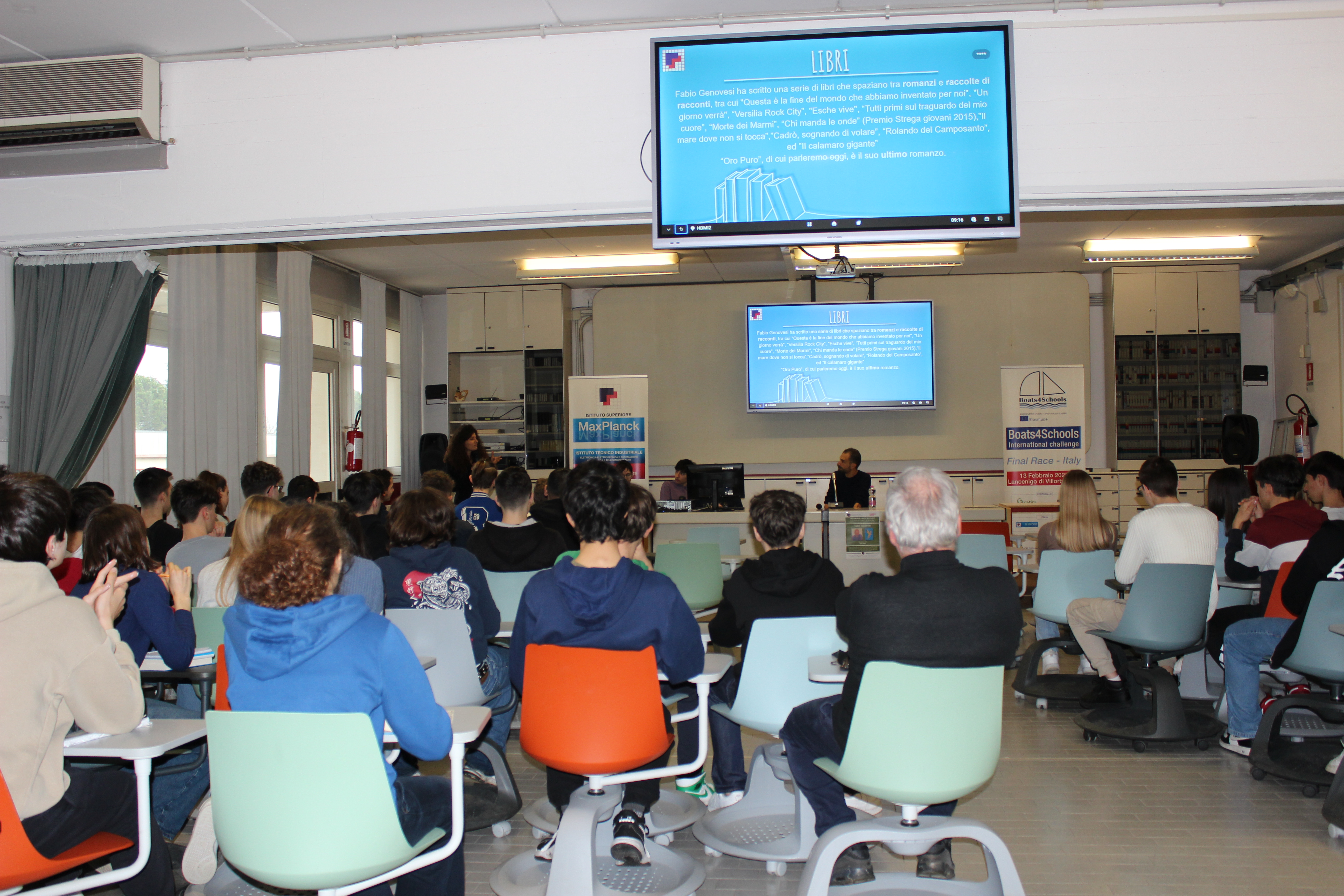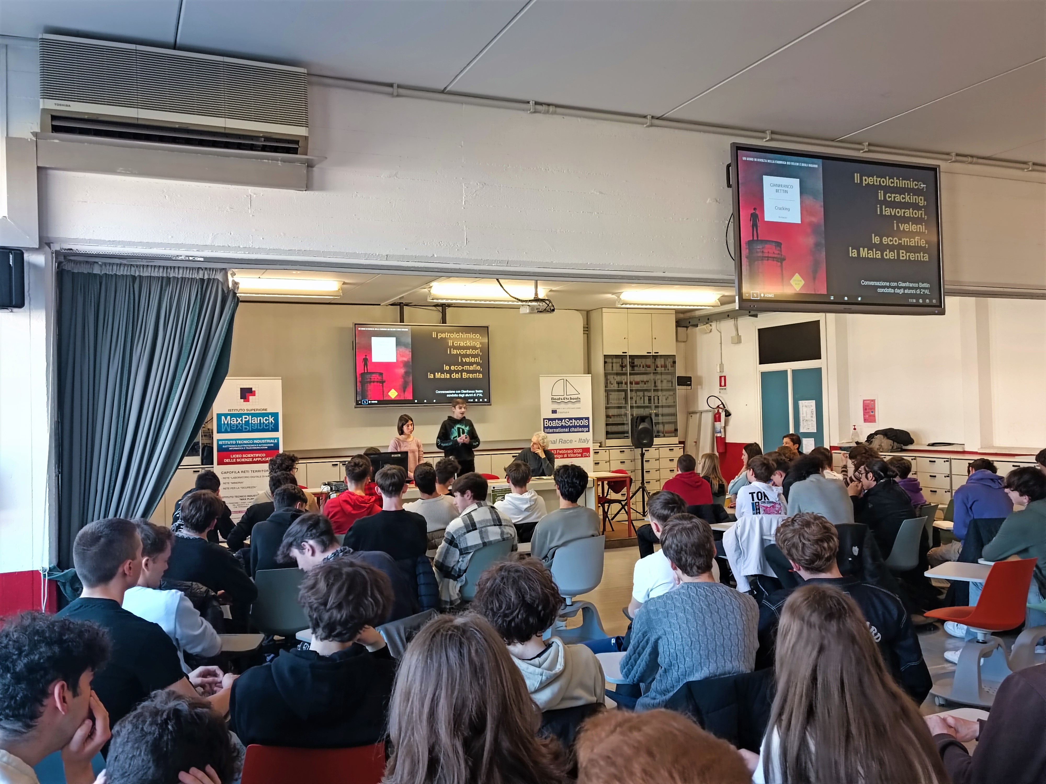 Foto dell'incontro con il saggista e scrittore Gianfranco Bettin che è ritornato all’istituto Max Planck per parlare di Porto Marghera e del petrolchimico. Lunedì 19 febbraio ha incontrato gli studenti per discutere del libro “ Cracking” e di come un romanzo possa anche essere uno strumento per aprire gli occhi sulla realtà quasi contemporanea.