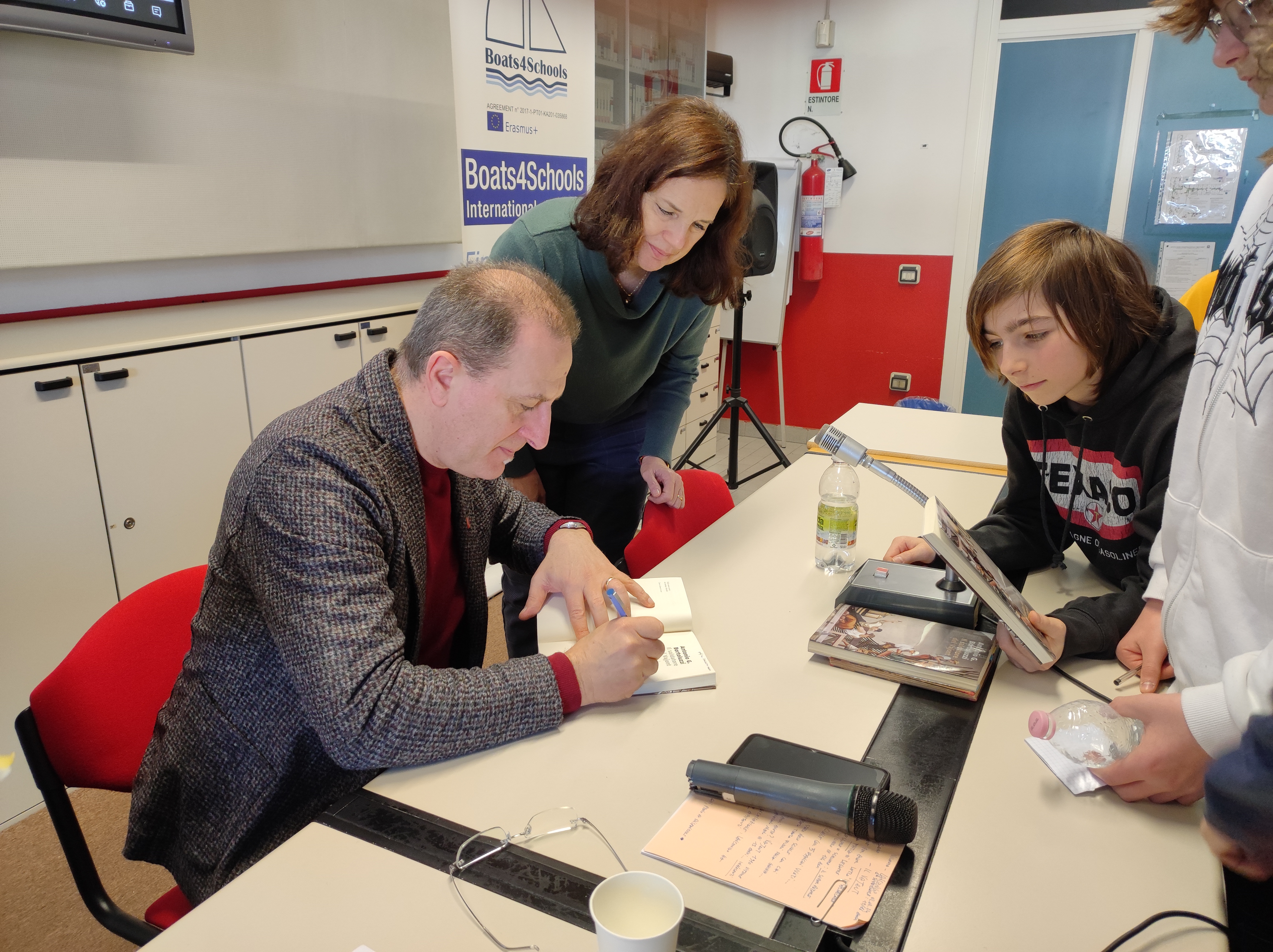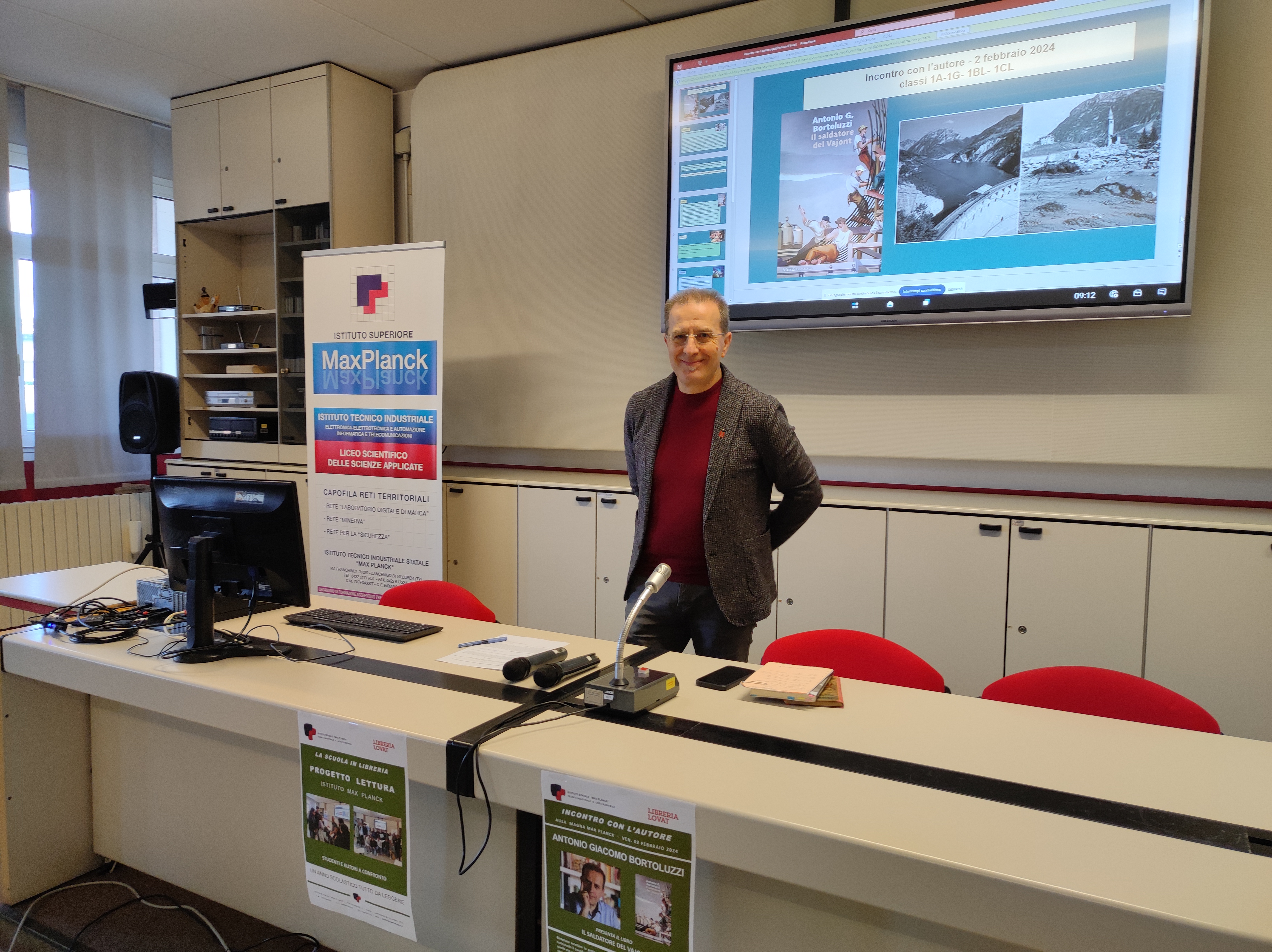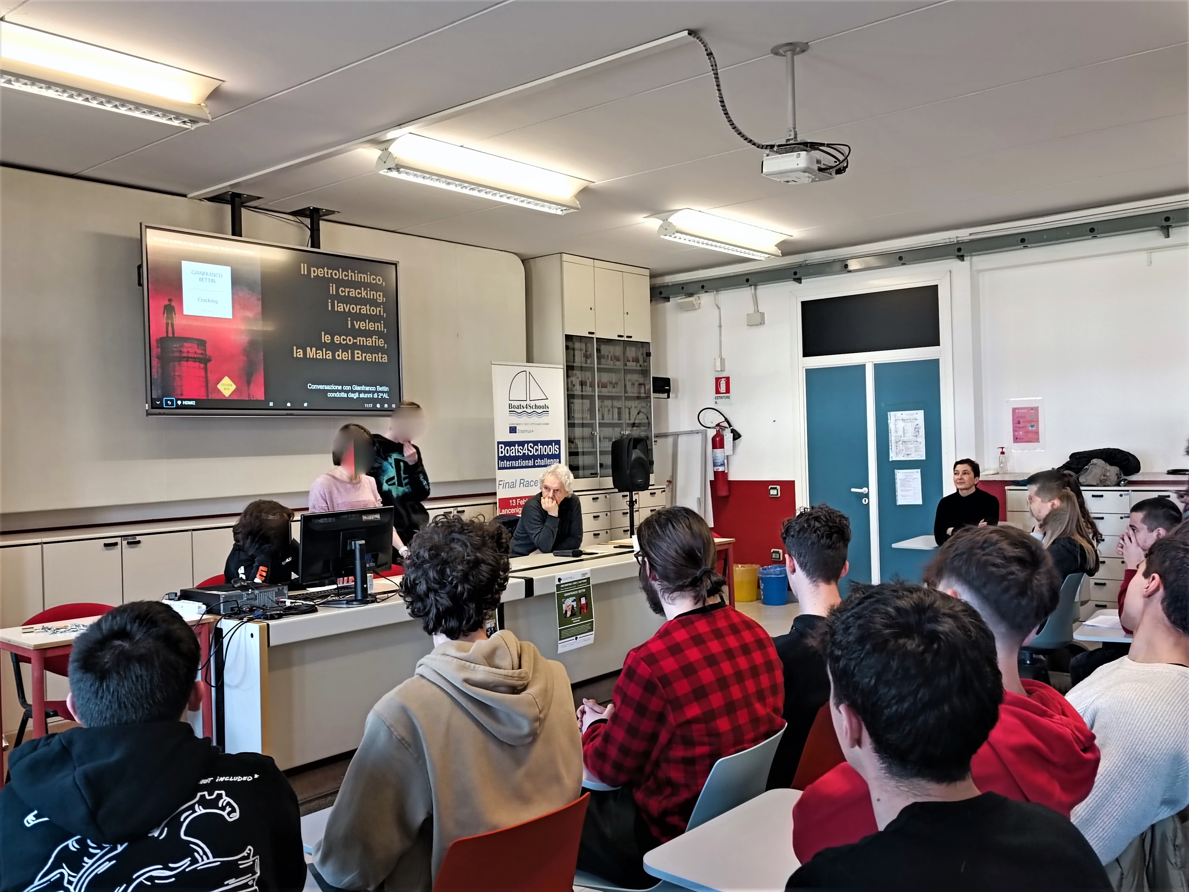 Foto dell'incontro con il saggista e scrittore Gianfranco Bettin che è ritornato all’istituto Max Planck per parlare di Porto Marghera e del petrolchimico. Lunedì 19 febbraio ha incontrato gli studenti per discutere del libro “ Cracking” e di come un romanzo possa anche essere uno strumento per aprire gli occhi sulla realtà quasi contemporanea.