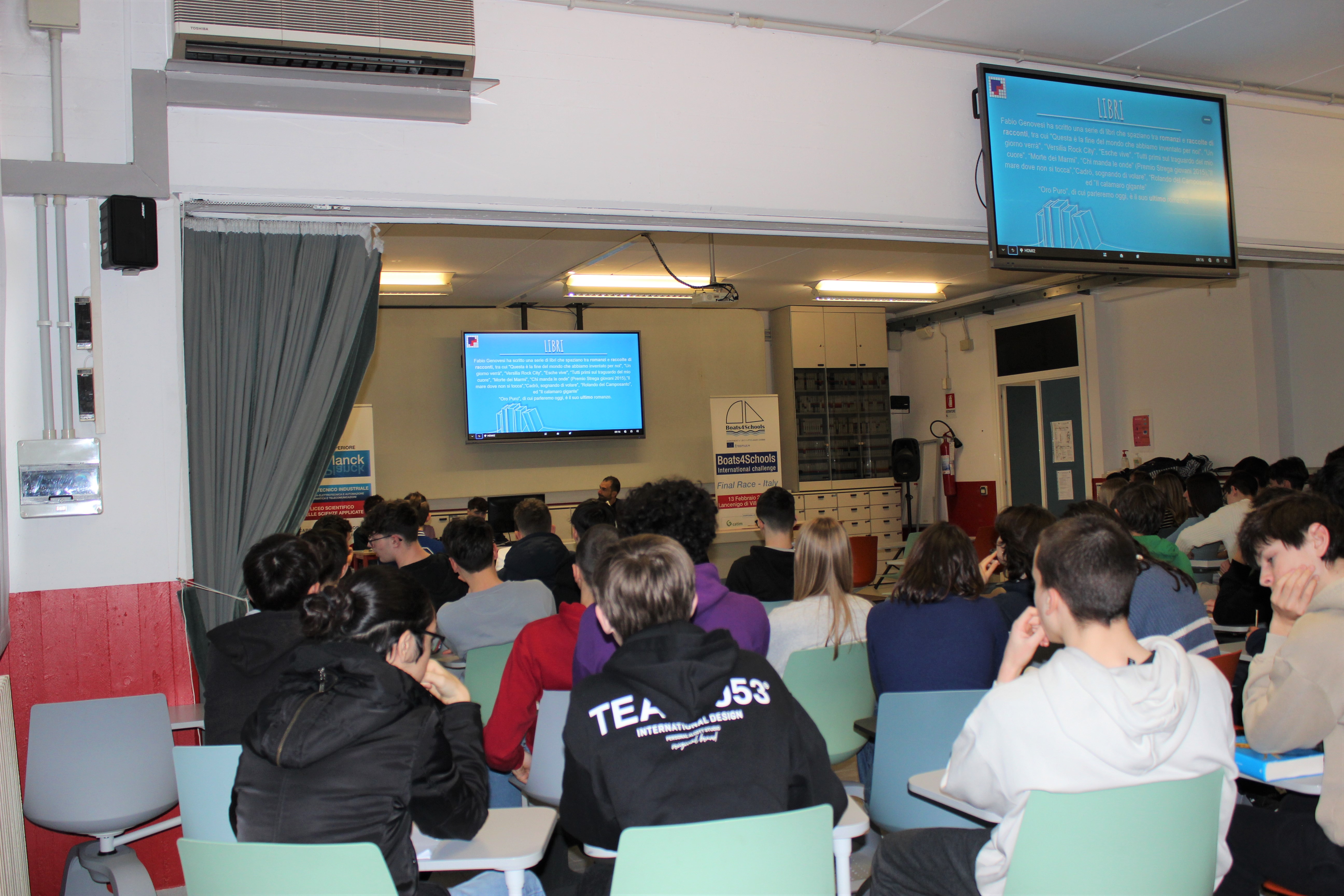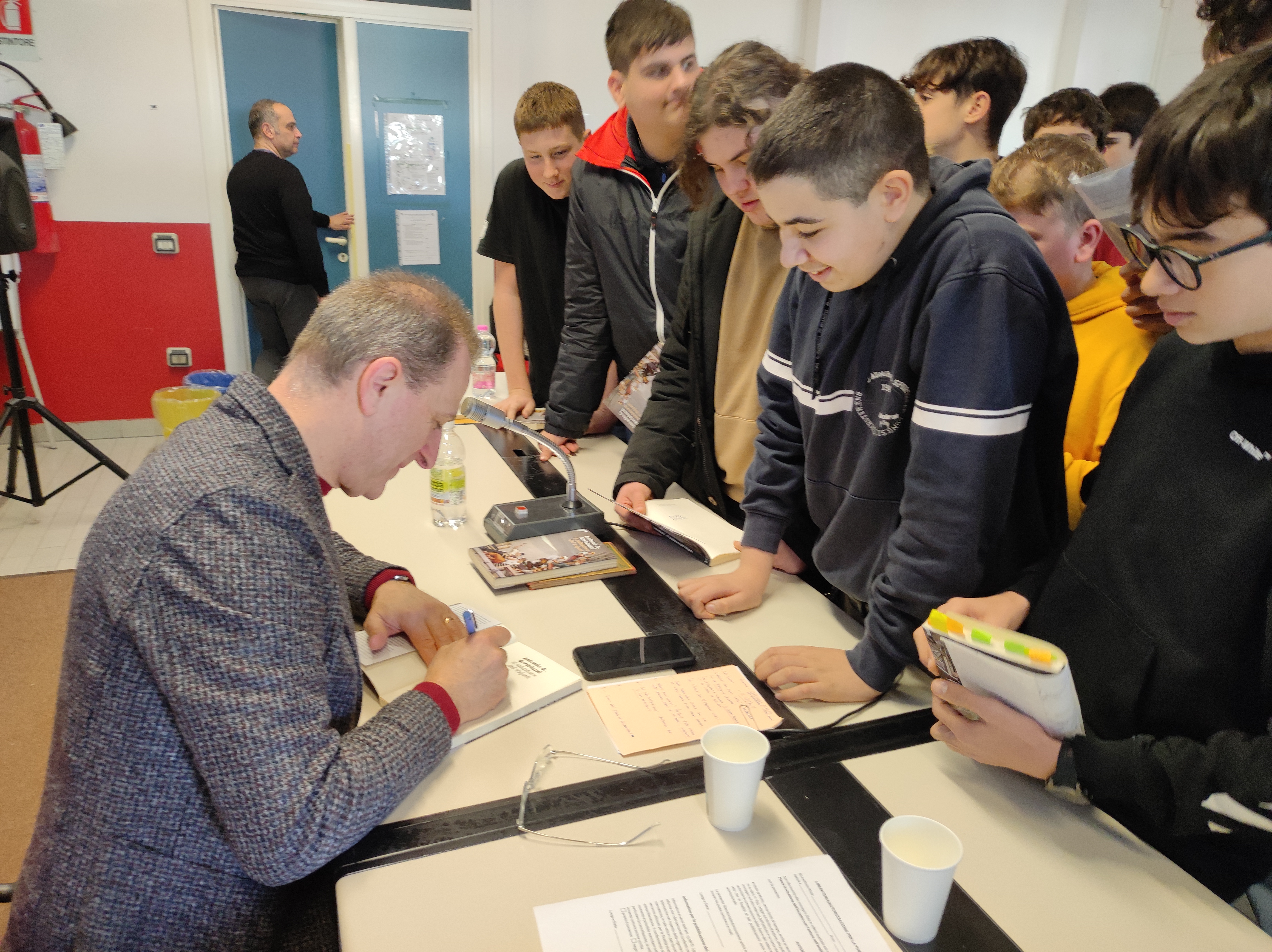 Foto dell'incontro di lunedì 4 marzo con l'autore Fabio Genovesi, tra i più apprezzati autori del panorama editoriale del momento, nonché voce “culturale” delle telecronache Rai al Giro d’Italia. Ha presentato agli studenti il suo ultimo libro “Oro puro” (edito da Mondadori e ora tra i candidati al premio Strega).