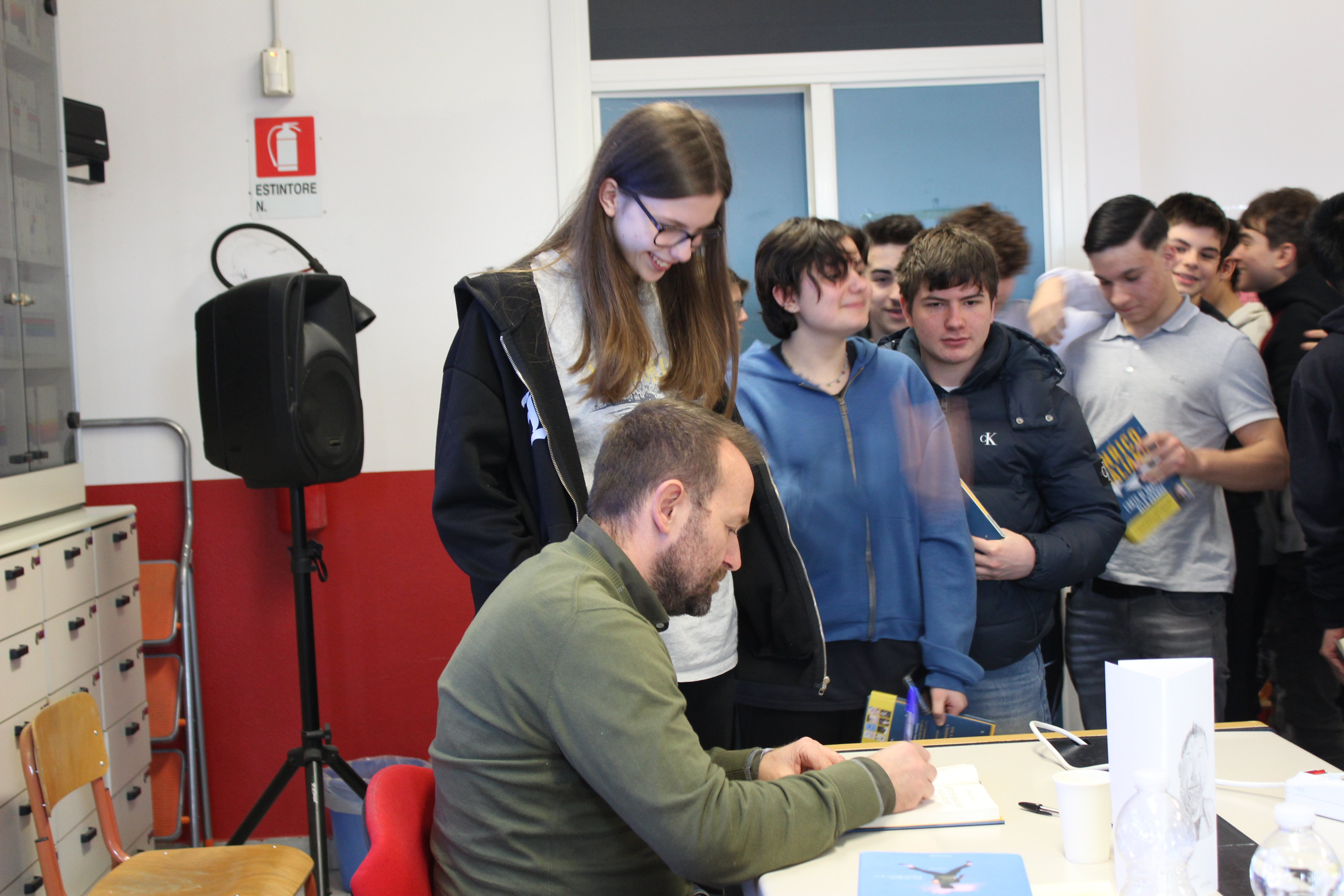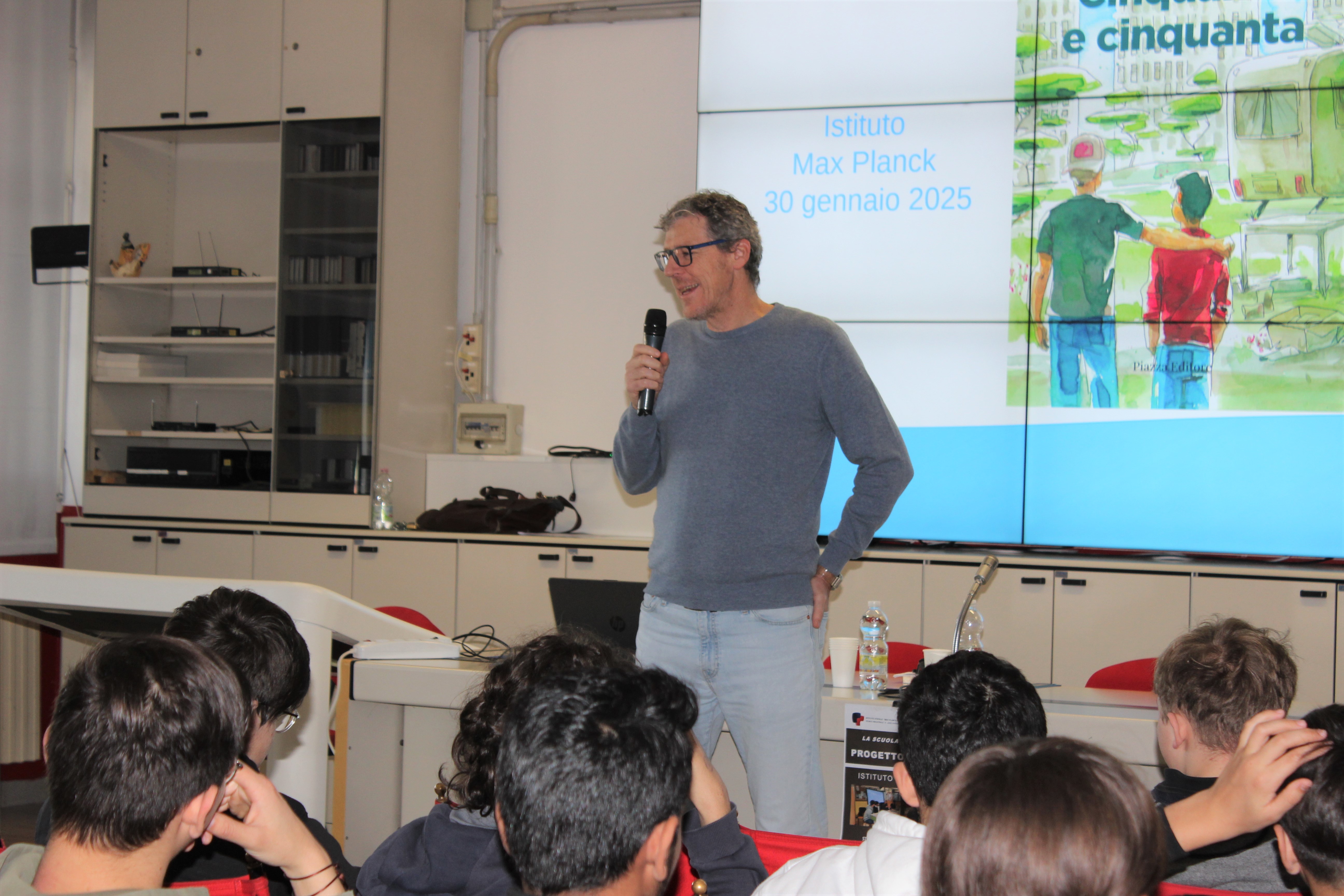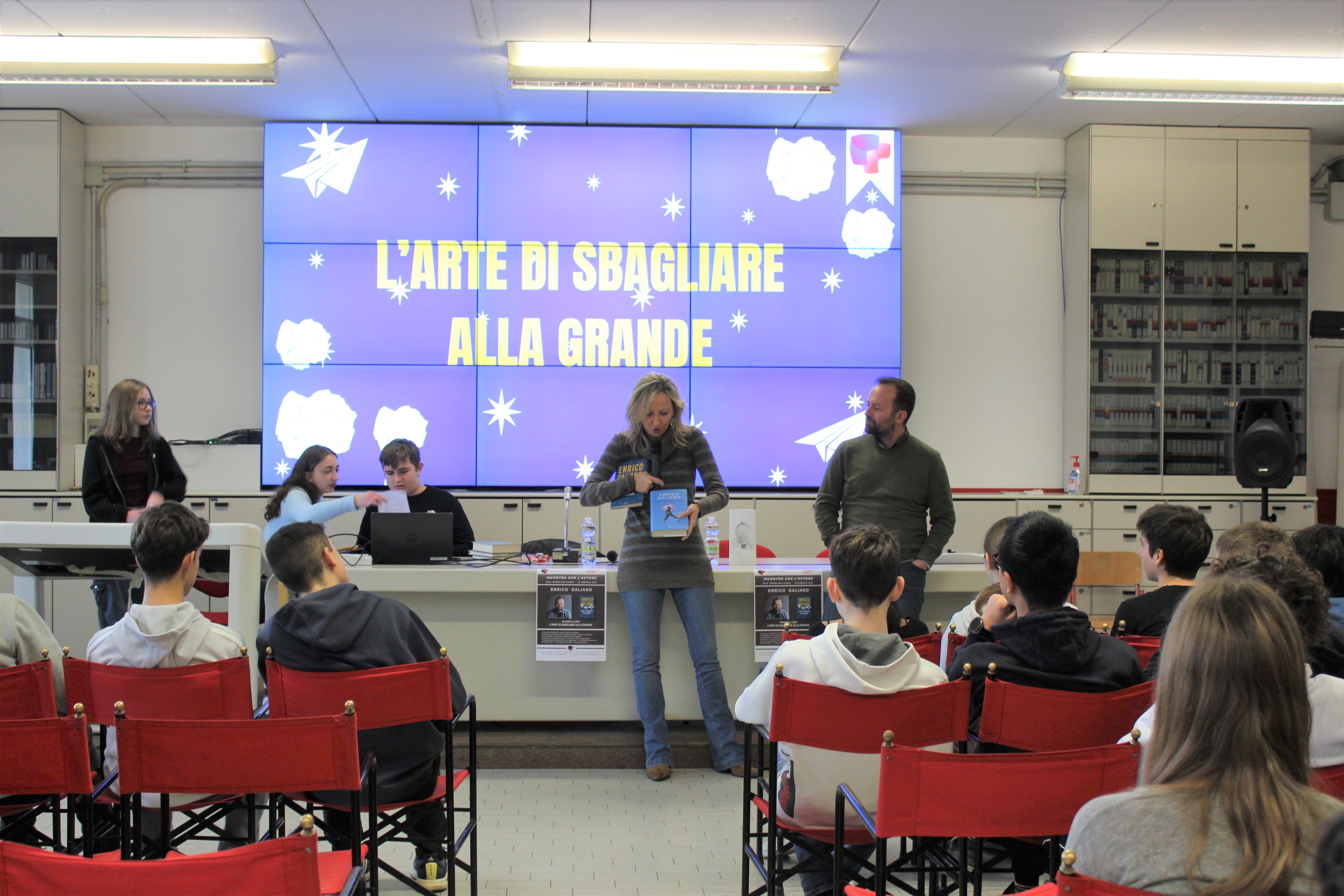 Foto dell'incontro di martedì 18 marzo 2025 con l'autore Enrico Galiano, insegnante, scrittore, attore, prof-youtuber che al Progetto Lettura del Max Planck ha parlato del suo libro “L’arte di sbagliare alla grande” successo editoriale del 2020.