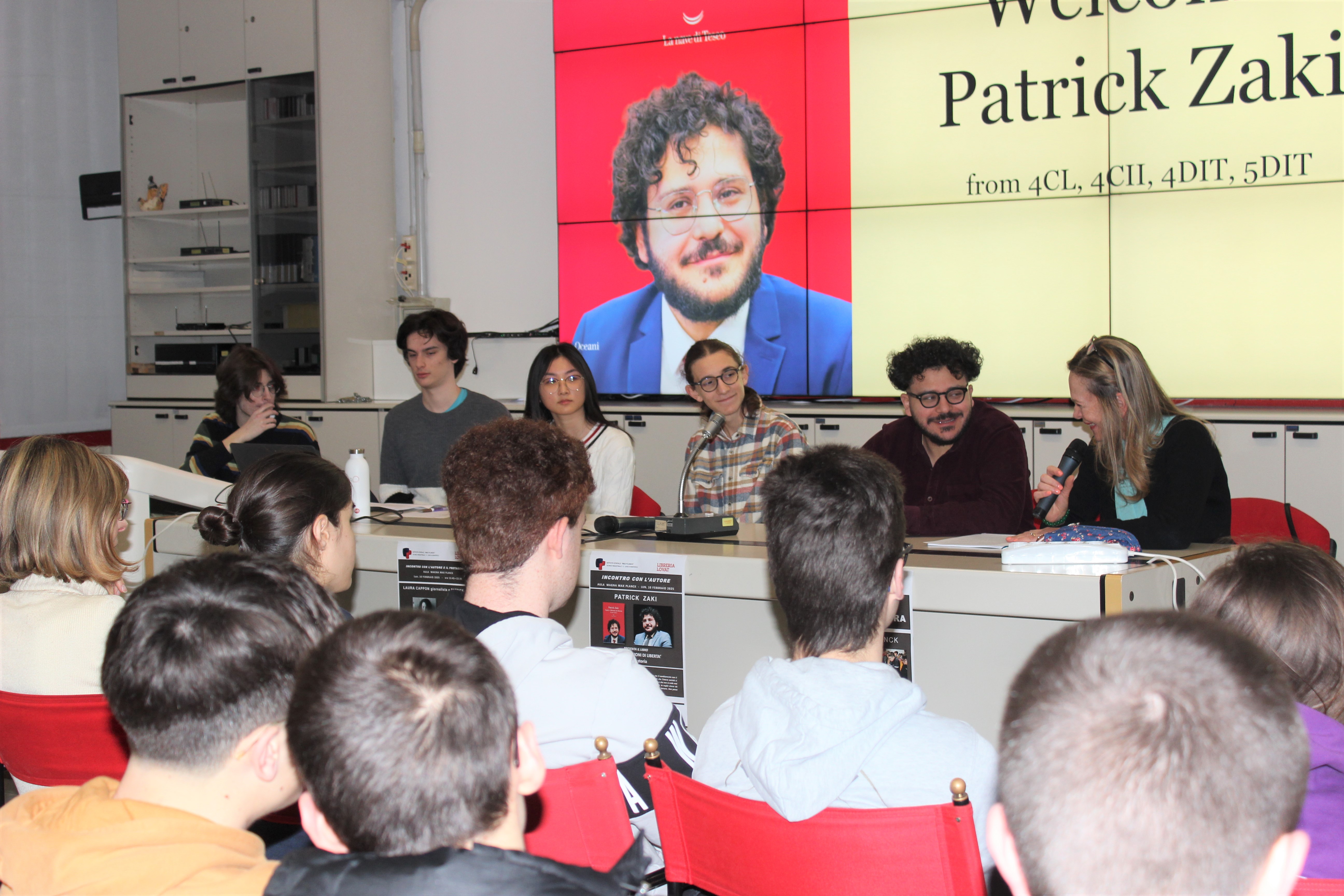 Foto dell'incontro del 10 febbraio 2025 con lo scrittore Patrick Zaki che ha presentato il suo libro autobiografico “Sogni e illusione di libertà. La mia storia” edito da La nave di Teseo.