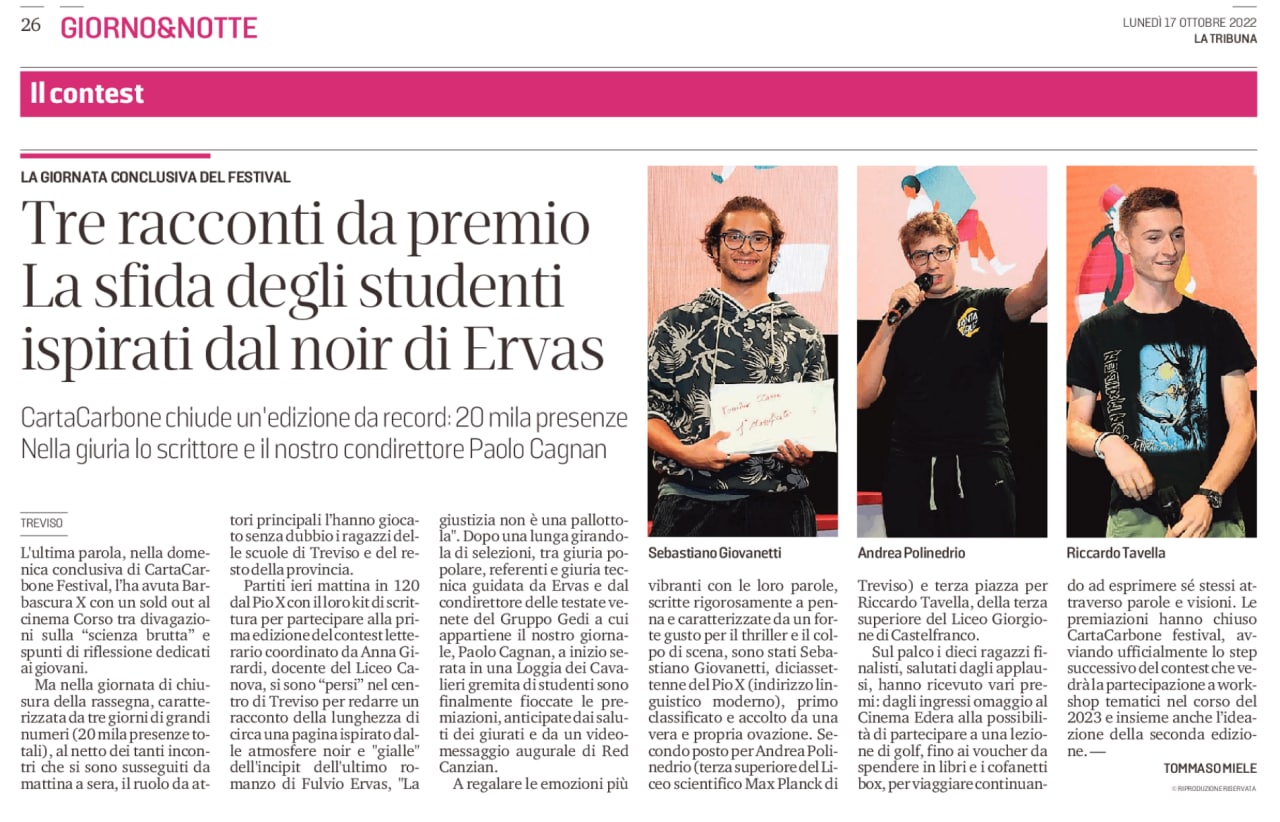 ANDREA POLINEDRIO della classe 3C liceo del nostro istituto si è aggiudicato il secondo posto nel concorso di scrittura “Carta CarboneContest- Scritture in movimento, scrittori per un giorno” tenutosi domenica 16 ottobre a Treviso.