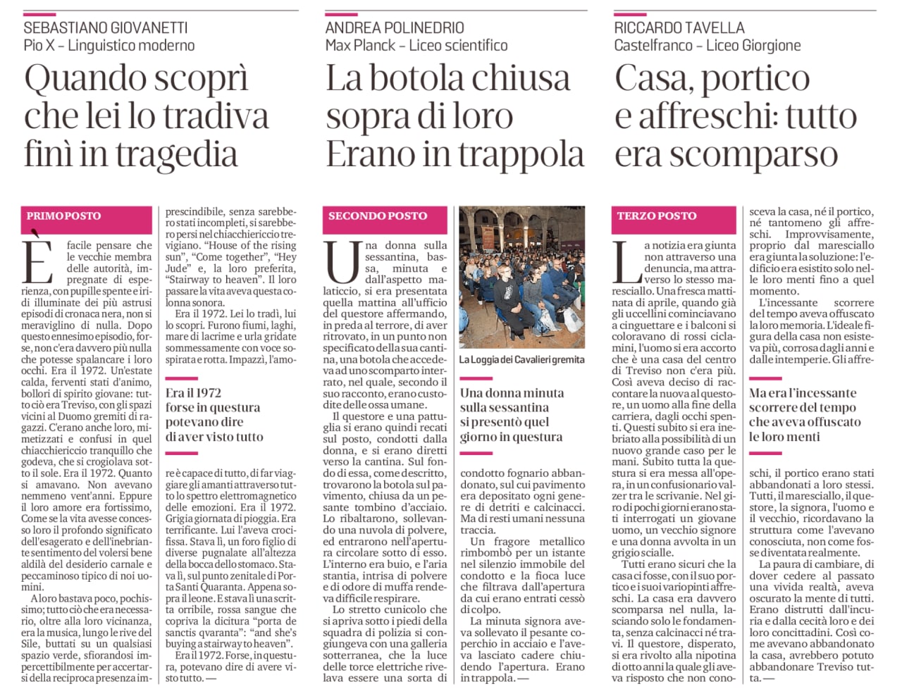 Complimenti vivissimi ad Andrea che si è distinto tra 120 partecipanti provenienti dalle scuole superiori della provincia, con un racconto scritto in due ore durante la mattinata all’aperto in città. La sua composizione è stata selezionata prima da una giuria di studenti-lettori che hanno definito i dieci finalisti e poi da una giuria tecnica presieduta dall’autore Fulvio Ervas, dal cui ultimo libro “La giustizia non è una pallottola” è stata tratta anche la traccia assegnata ai concorrenti.