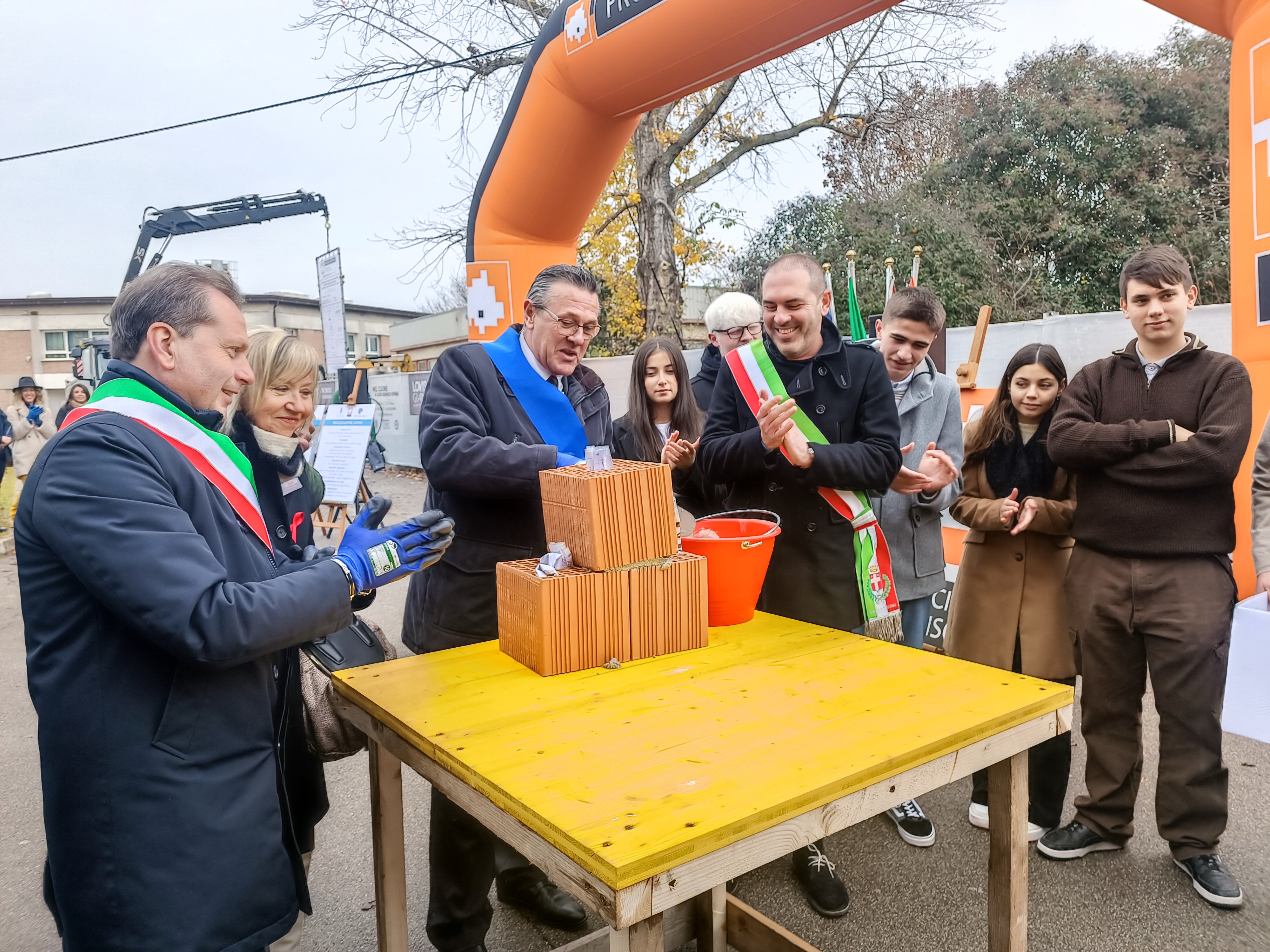 Il presidente della Provincia ha inaugurato i lavori. Un mattone con bigliettini augurali di studenti e docenti sarà inserito nel muro.