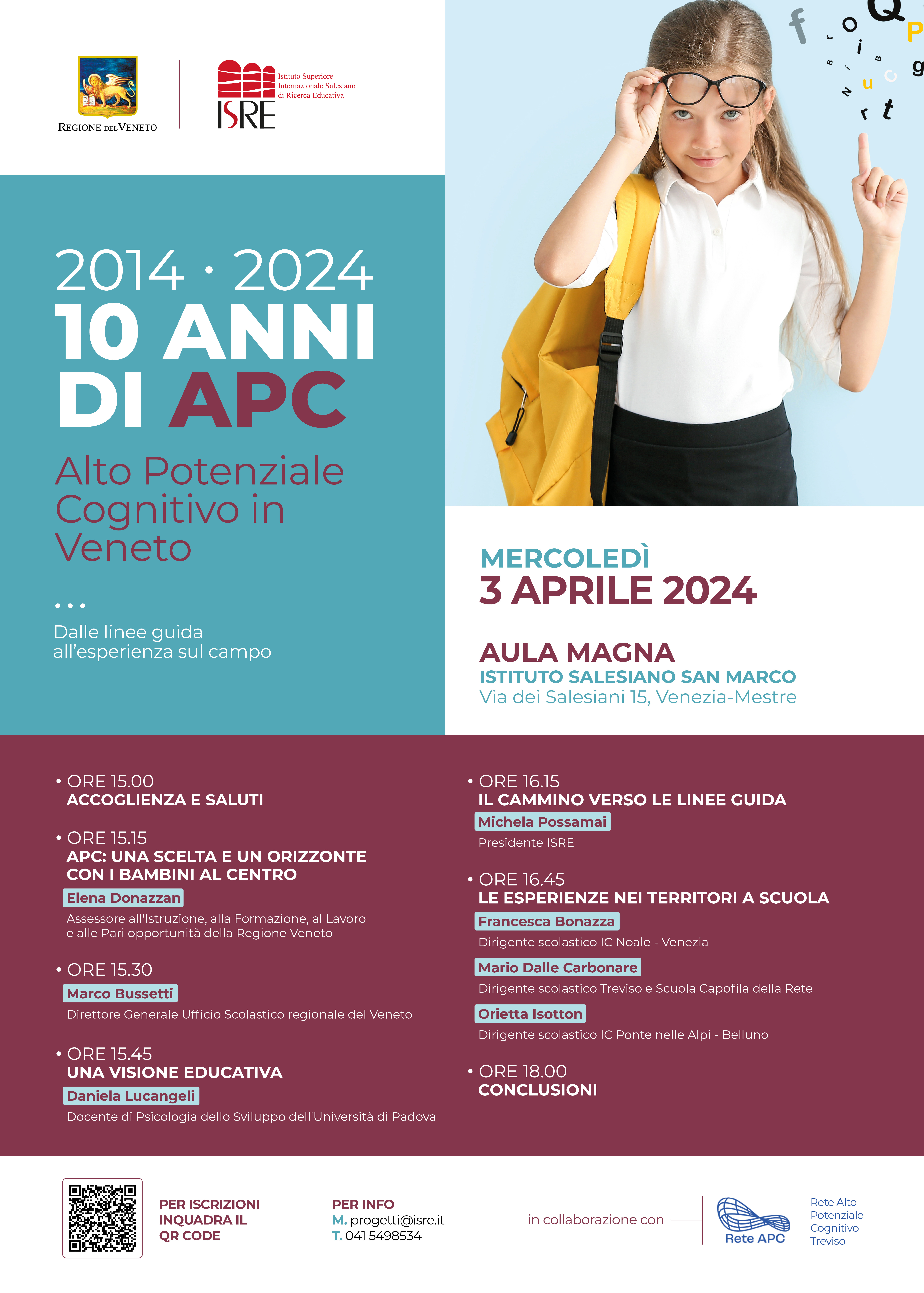 Pubblicato: 22 Marzo 2024 clicca per ingrandire la locandina Convegno per il decennale delle Linee-guida della Regione del Veneto sull’alto potenziale cognitivo che si terrà a Venezia-Mestre mercoledì 3 aprile 2024