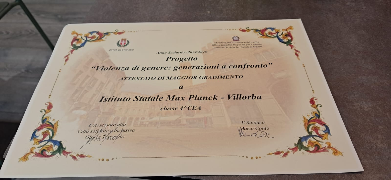 In occasione degli atti finali del Progetto “Violenza di genere: generazioni a confronto” (Chiostro di Santa Caterina di Treviso, 22 maggio 2025) la classe 4CEA del nostro Istituto, coadiuvata dai docenti prof.ssa Amadio e prof. Bonesso,